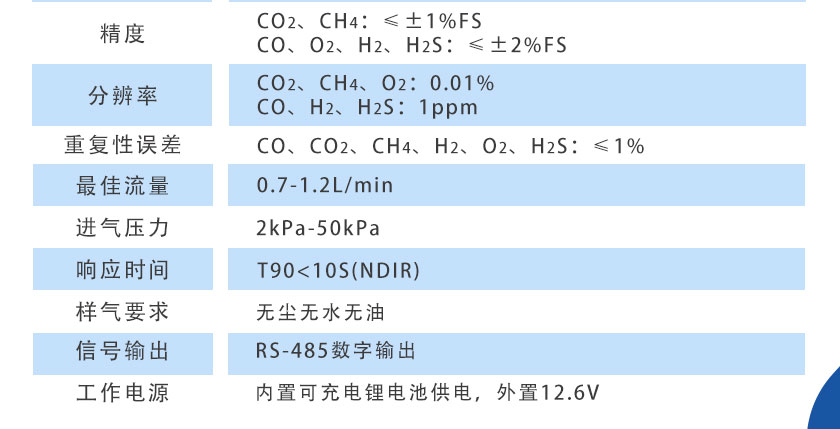 CO、CO2、CH4:NDIR非分光紅外;H2:TCD熱導;O2、H2S:ECD電化學 |