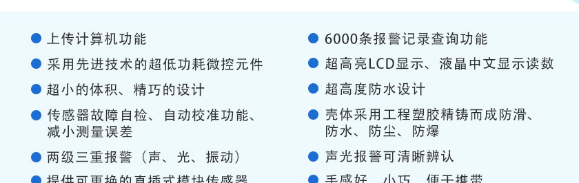 采用進口催化燃燒傳感器和微控制器技術,帶2.5寸高清彩屏實時顯示,無聲光+視覺報警,現場多種氣體濃度 24 小時連續(xù)在線監(jiān)測及溫濕度的測量,適用于各種環(huán)境中的可燃氣體濃度檢測,響應速度快,測量精度高,穩(wěn)定性和重復性好,整機性能居國內領先水平。儀器具有多種超強的電路保護功能,可防止錯接電源、反接電源、電源短路、電源不穩(wěn)、電源與信號錯解等,導致的儀器損壞。