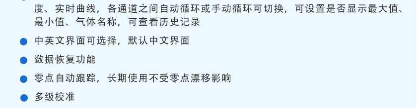 采用進口催化燃燒傳感器和微控制器技術,帶2.5寸高清彩屏實時顯示,帶聲光+視覺報警,現場多種氣體濃度 24 小時連續在線監測及溫濕度的測量,適用于各種環境中的可燃氣體濃度檢測,響應速度快,測量精度高,穩定性和重復性好,整機性能居國內領先水平。儀器具有多種超強的電路保護功能,可防止錯接電源、反接電源、電源短路、電源不穩、電源與信號錯解等,導致的儀器損壞。