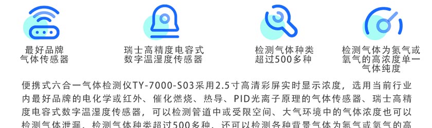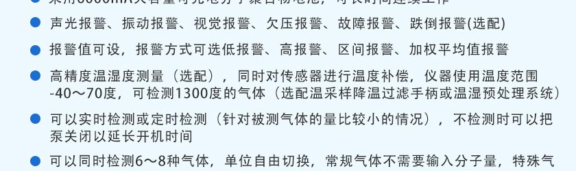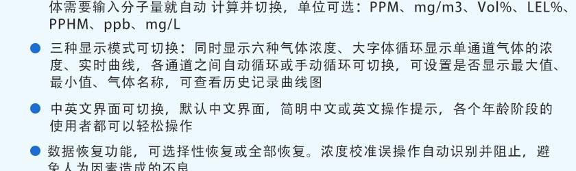 可檢測任意6種氣體濃度和溫濕度,最多可擴展到8種氣體,視傳感器和現(xiàn)場環(huán)境而定 |