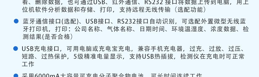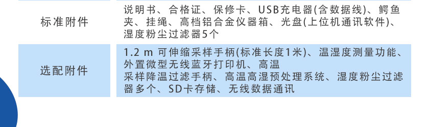 1.2m可伸縮采樣手柄(標準長度1米)、溫濕度測量功能、外置微型無線藍牙打印機、高溫采樣降溫過濾手柄、高溫高濕預處理系統(tǒng)、濕度粉塵過濾器多個、SD卡存儲、無線數(shù)據(jù)通訊 |