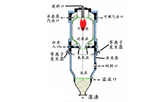 等離子氣化爐中產生的等離子體,由等離子火炬采用380V交流電產生。等離子體的發生裝置功率在5kW~300kW,溫度可達4000℃~7000℃,射流速度超過200m/s,工作氣體為氮氣、空氣、氫氣等。在高強度熱源下,基本粒子的活動能量遠大于任何分子間化學鍵的作用,物質的微觀運動以原子熱運動為主,原有物質被打碎為原子物質,以破壞有害成分或使其喪失活力,從而將復雜的物質轉化為簡單的無害物。