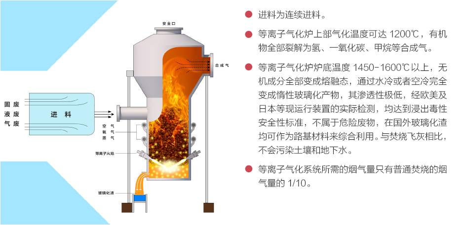等離子氣化是一種新興技術,它可以從垃圾中提取可回收的物品和轉換碳基廢物為合成氣。這種類似于天然氣的合成氣是一種簡單的一氧化碳和氫氣為主要成份的可燃氣體,可以直接燃燒或用于提煉成更高等級的燃料和化學品。冷卻后的灰渣是一種玻璃狀物質,由于其緊密的結構,非常適合作為建筑材料使用。等離子技術已在如危險廢棄物/醫療廢棄物焚燒飛灰和化學武器殘留物等危險廢物無害化處理中成功應用多年。利用等離子氣化技術將城市固體廢棄物轉化為能源和建材是一項新技術,具有很大的潛力。