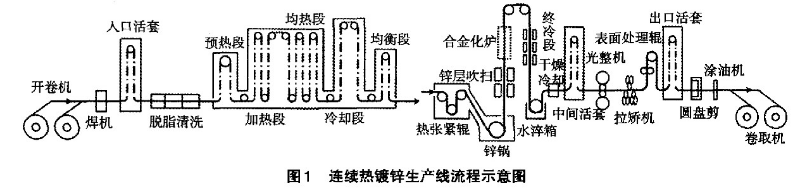 開卷→焊接→脫脂清洗→退火爐→(預(yù)熱→加熱→均熱→冷卻→均衡)→熱浸鍍鋅→(合金化爐)→鍍后冷卻→光整→拉矯→表面處理(鈍化/耐指紋)→切邊→在線質(zhì)量檢測→涂油→卷取。其流程示意圖如圖1所示。