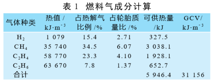 工藝條件不同、廢舊輪胎的差異及計算方式的誤差都可能導致得出裂解氣的GCV不盡相同。在550℃時的熱解氣熱值進行計算,氣體量產占輪胎質量百分比17.6%,僅計算熱解氣的主要成分H2、CH4、C2H4、C2H6,計算結果如表1所示。
