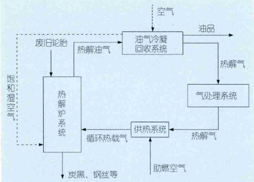 目前處理廢舊輪胎的方法有原型改制、生產再生膠和膠粉、焚燒以及熱解等, 其中熱解技術一種很具潛力的處理廢舊輪胎的方法。廢舊輪胎熱解技術是將廢舊輪胎在缺氧或惰性氣體中進行熱分解, 可產生熱解氣、熱解油和炭殘渣等。這些產品經進一步加工處理可轉化成具有各種用途的高價值產品。與傳統處理方法相比, 熱解法不僅可以回收高附加值的產物, 而且可以回收近 70%的能源, 具有較高的經濟和環境效益。