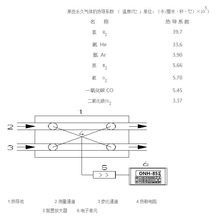 每個通道有兩個熱敏電阻 ( 4 ),檢測每個通道的熱敏變化。熱敏電阻連接在惠斯登電橋上,檢測輸出信號。信號通過放大器 ( 5 ), 傳輸到電子單元 ( 6 ),無需調節,自動回零。恒溫的環境,保證測量池不受影響。
