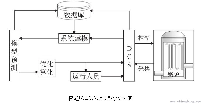 鍋爐智能燃燒優(yōu)化的實質是通過先進檢測裝置檢測鍋爐各關鍵運行參數(shù)并對這些參數(shù)進行實時分析處理,然后采用AI優(yōu)化控制算法在線調整鍋爐運行參數(shù),使鍋爐燃燒的各類運行參數(shù)處于最佳狀態(tài)。智能燃燒優(yōu)化系統(tǒng)一般為基于電廠現(xiàn)有DCS控制系統(tǒng)的控制系統(tǒng),無需對鍋爐進行改造,投資少、風險小且優(yōu)化效果顯著。如圖1所示為智能燃燒優(yōu)化控制系統(tǒng)結構圖,系統(tǒng)分為開環(huán)操作指導和閉環(huán)監(jiān)控兩種優(yōu)化方式,開環(huán)方式為智能優(yōu)化系統(tǒng)將各被控量的調節(jié)值提交給運行人員,由運行人員手動對DCS系統(tǒng)進行調節(jié);閉環(huán)方式為智能優(yōu)化系統(tǒng)將各被控量的調節(jié)指令直接上傳至DCS系統(tǒng)中,自動完成優(yōu)化調節(jié)。
