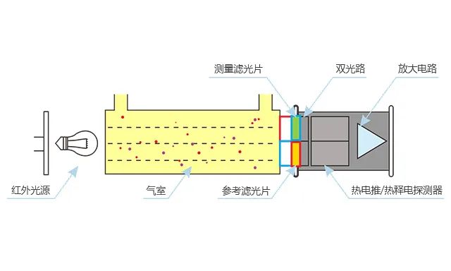利用這些窗口濾波紅外探測器,不用進行分光,從而可以直接測量對應濾波片波段也即相應氣體吸收波段的紅外光強度,這樣的氣體傳感器稱為非分光紅外(NDIR)氣體傳感器。