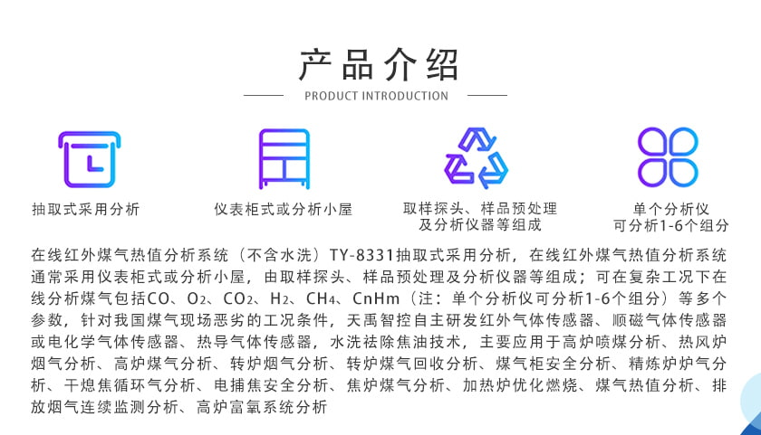 天禹智控在線紅外煤氣熱值分析系統TY-8331,抽取式采用分析,主要應用于高爐噴煤分析、熱風爐煙氣分析、高爐煤氣分析、轉爐煙氣分析、轉爐煤氣回收分析、煤氣柜安全分析、精煉爐爐氣分析、干熄焦循環氣分析、電捕焦安全分析、焦爐煤氣分析、加熱爐優化燃燒、煤氣熱值分析、排放煙氣連續監測分析、高爐富氧系統分析。 在線紅外煤氣熱值分析系統通常采用儀表柜式或分析小屋,由取樣探頭、樣品預處理及分析儀器等組成;可在復雜工況下在線分析煤氣包括CO、O?、CO?、H?、CH?、CnHm(注:單個分析儀可分析1-6個組分)等多個參數,針對我國煤氣現場惡劣的工況條件,天禹智控自主研發紅外氣體傳感器、順磁氣體傳感器或電化