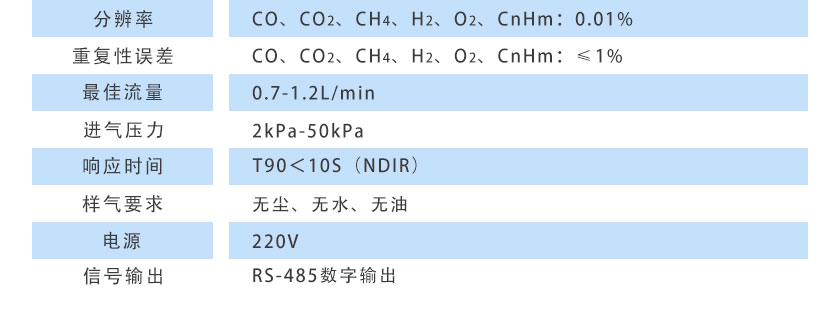 CO、CO2、CH4、CnHm:≤±1%FS H2、O2:≤±2%FS |
