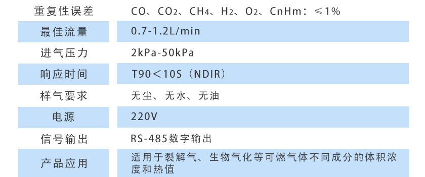 CO、CO2、CH4、CnHm:≤±1%FS;H2、O2:≤±2%FS