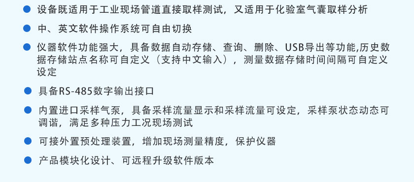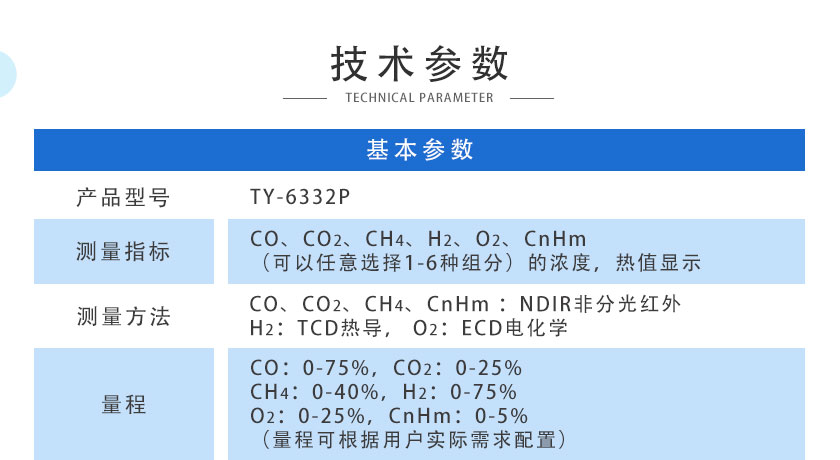 CO:0-75%,CO2:0-25% ,CH4:0-40%,H2:0-75%,O2:0-25%,CnHm:0-5%(量程可根據用戶實際需求配置)