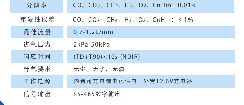 CO、CO2、CH4、CnHm:≤±1%FS;H2、O2:≤±2%FS