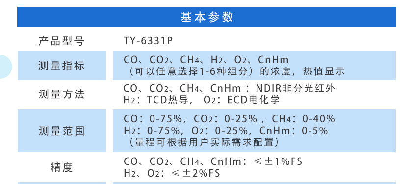 CO:0-75%,CO:20-25% ,CH4:0-40%,H2:0-75%,O2:0-25%,CnHm:0-5%(量程可根據用戶實際需求配置)